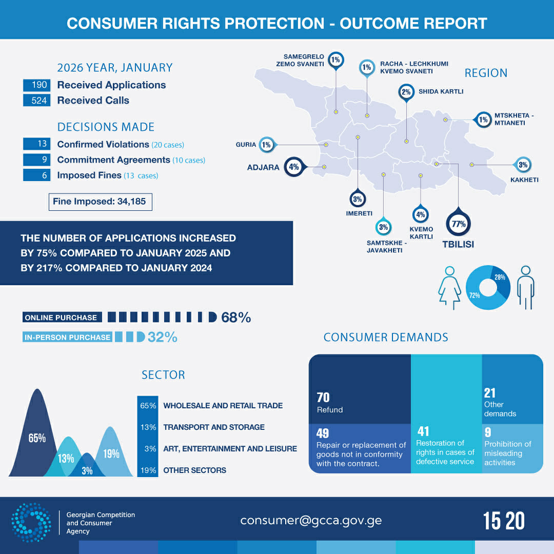 During the reporting period, the Georgian Competition and Consumer Agency (GCCA) identified 13 violations of consumer group rights in 20 cases. Due to non-compliance with obligations imposed by the GCCA, 6 traders were fined in 13 cases, with total penalties amounting to 34 185 GEL. For consumer protection, 9 commitment agreements were signed in 10 cases, where traders committed to modifying their internal business policies and restoring the rights of affected consumers who suffered due to unfair business practices.